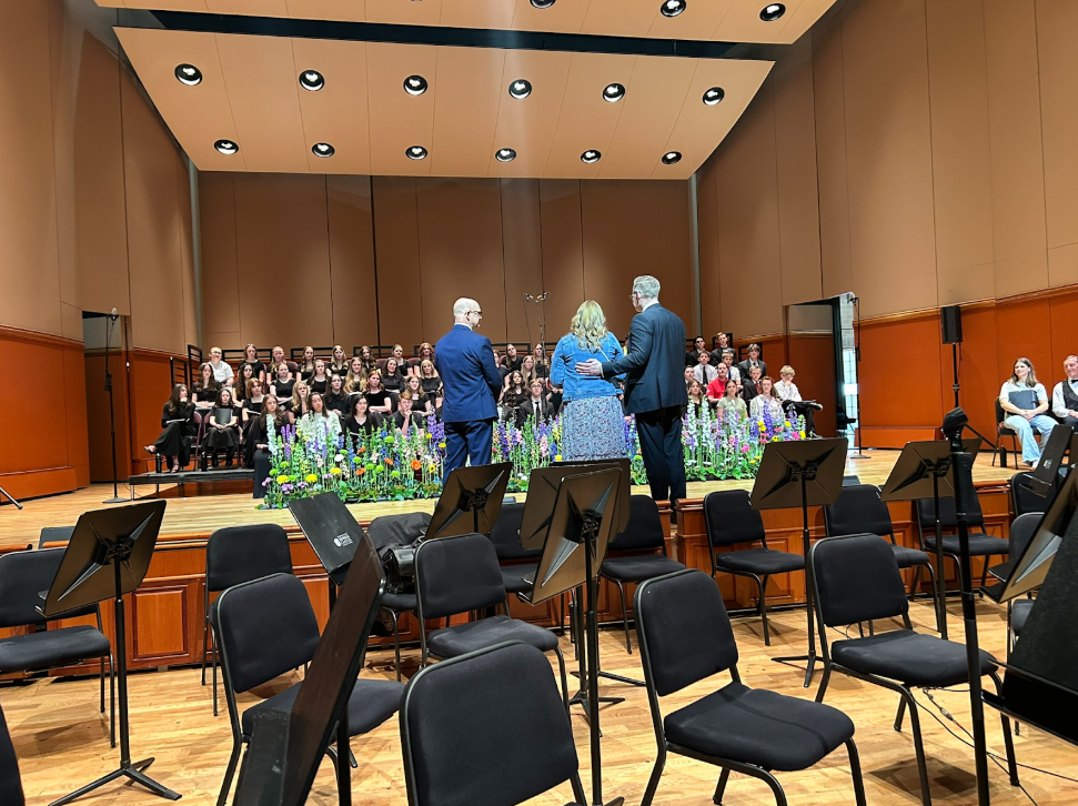 Cornerstone Chorale Director, Steven Williams, and to his right, solo cellist Angelyn Foster, at the conclusion of Lamb of God, March 26, 2026. Photo by Corey Christiansen.