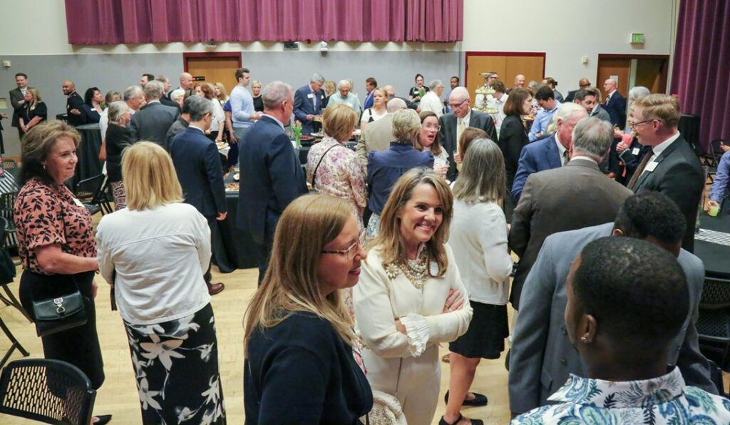 Lamb of God Community Leaders Reception at University of Denver. Sister Claire Hirst in foreground, and Elder Karl D. Hirst, right, visit with guests. March 26, 2026. Photo by Corey Christiansen.