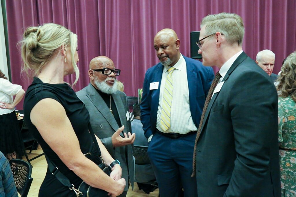Behka White, Interfaith Representative of Metro Denver Church Communication Council, Pastor Thomas Mayes of Living Water Christian Center and NAACP, Omar Montgomery, Rocky Mountain State Conference President, NAACP and Elder Karl D. Hirst visit at Community Leaders Reception, March 26, 2026. Photo by Corey Christiansen.