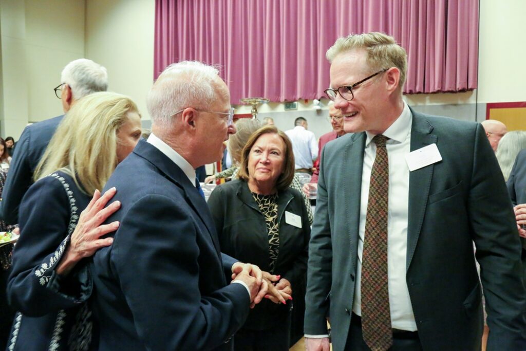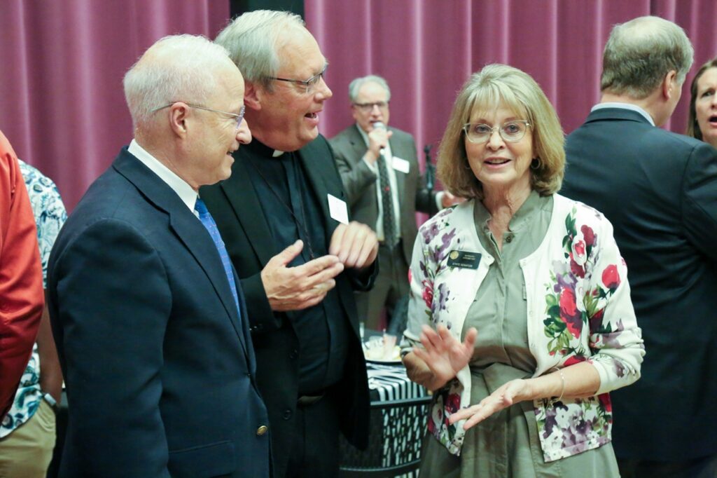 Aurora, Colorado Mayor Mike Coffman, Tim Heaton of Catholic Charities and Barbara Kirkmeyer, Colorado State Senator, visit at Community Leaders Reception at University of Denver’s Newman Center before Lamb of God performance. March 26, 2026. Photo by Corey Christiansen.