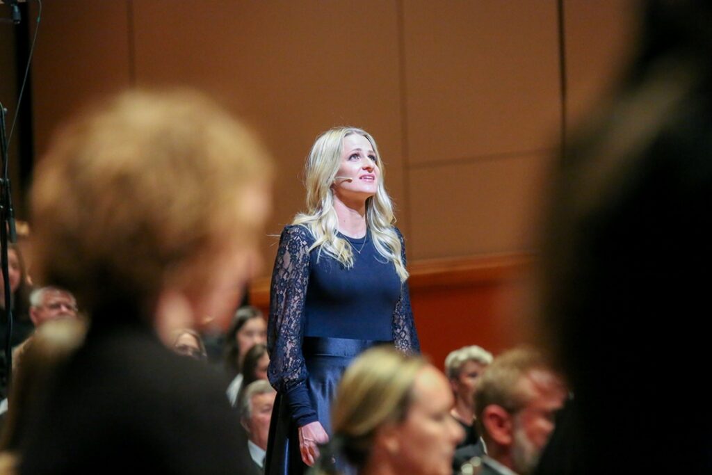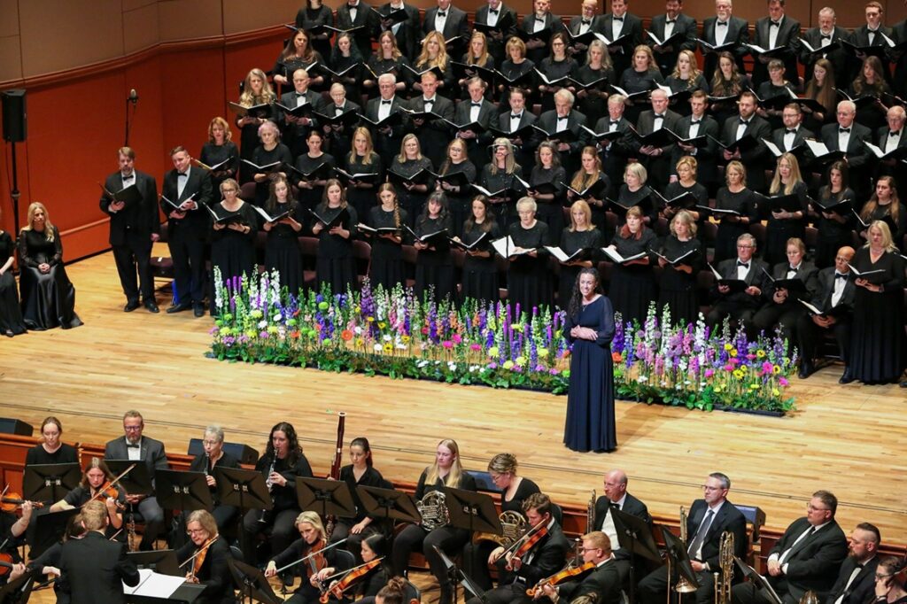 Claire Nelson singing the part of Mary, the mother of Jesus, in Lamb of God, March 26, 2026. Cornerstone Chorale and Orchestra behind and in front of her. Photo by Corey Christiansen.