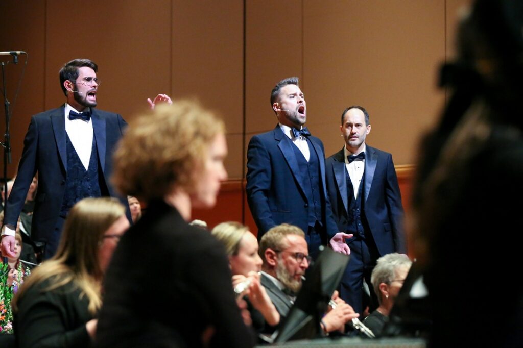 March 26, 2026 – opening night of Rob Gardner’s Lamb of God at The Newman Center for the Performing Arts. Ryden Frederick as Thomas, Ross Welch as Peter and Tyler Stoehr as John with members of the Cornerstone Orchestra. Photo by Corey Christiansen.